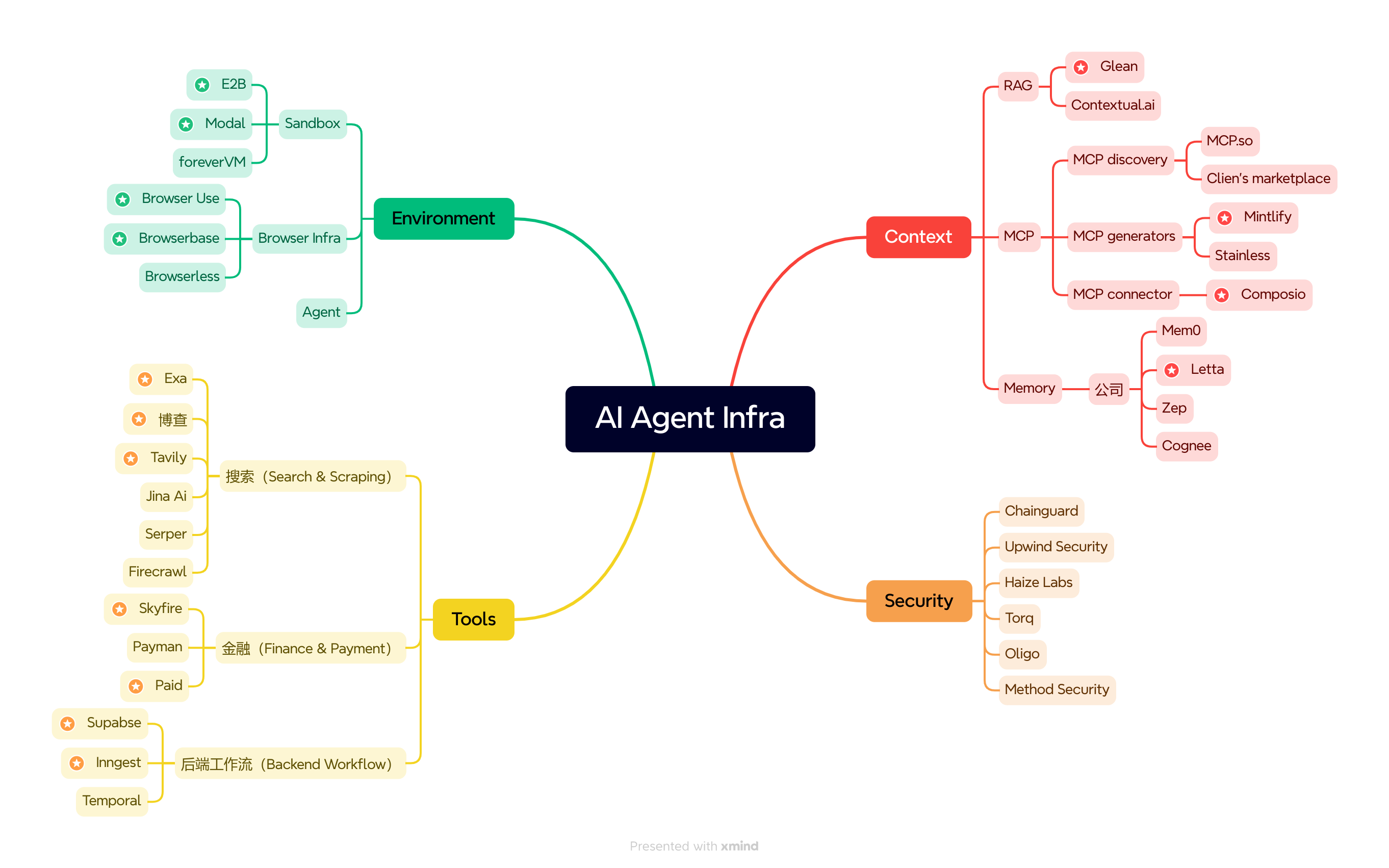 Tools 相关的 Infra 使 Agent 能够便捷调用各类工具,实现搜索、UI 设计、数据访问、支付等多样化的任务。随着 Agent 交互复杂度的持续上升,工具层正迅速扩展。搜索(Search & Scraping)、金融(Finance & Payment)、后端工作流(Backend Workflow)这三类工具,尤为值得重点关注。