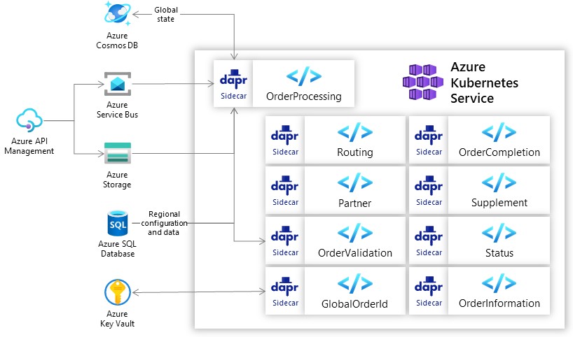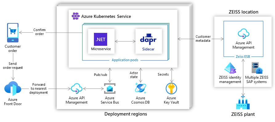 蔡司订单处理逻辑在 AKS 中与 Dapr 结合使用在区域上运行。唯一的订单号全局存储在 Azure Cosmos DB 中。