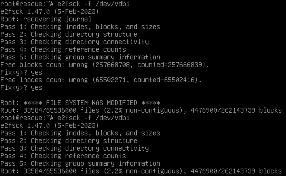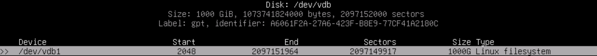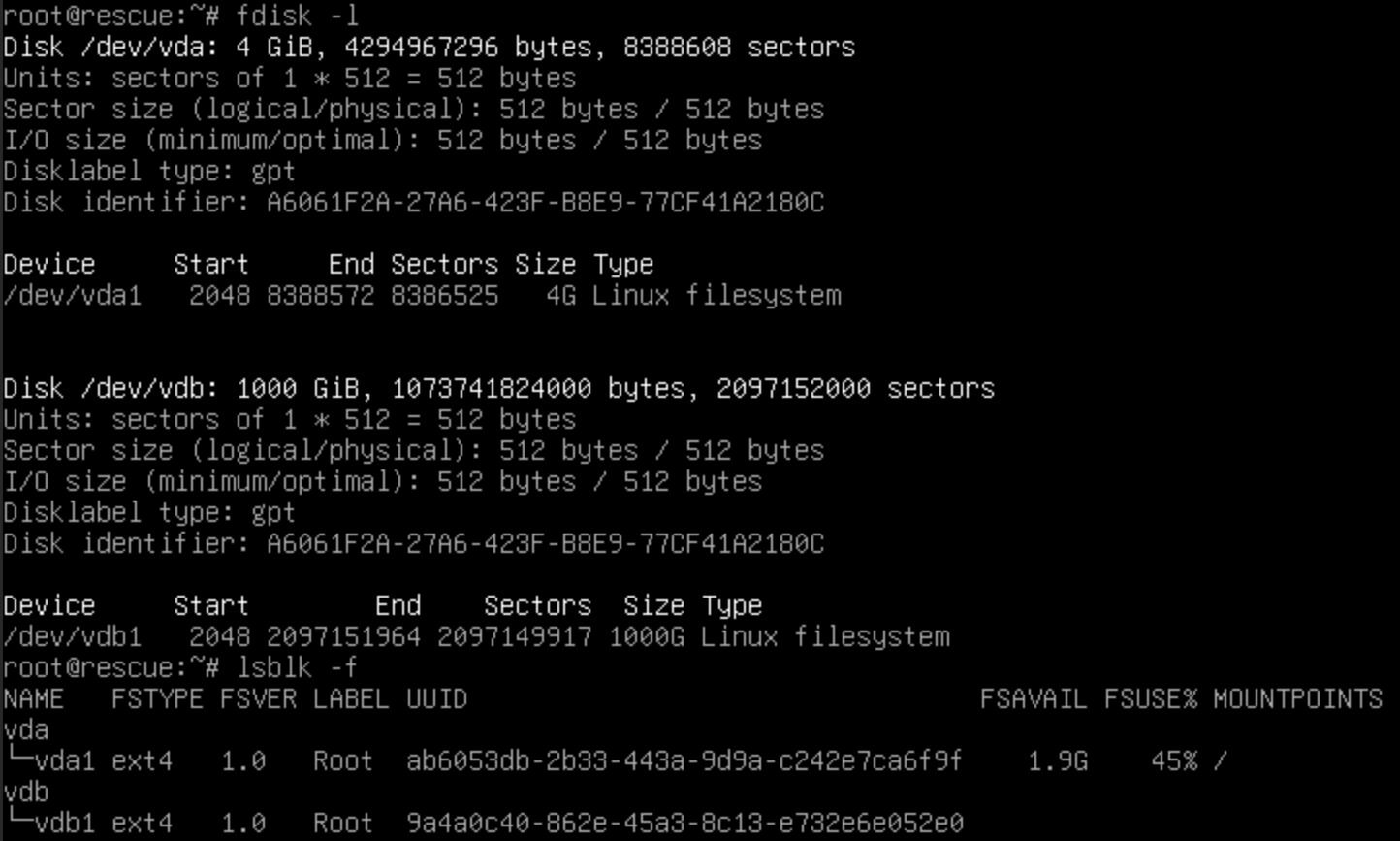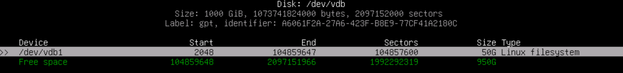 $ fdisk -l Disk /dev/vda: 1000 GiB, 1073741824000 bytes, 2097152000 sectors Units: sectors of 1 * 512 = 512 bytes Sector size (logical/physical): 512 bytes / 512 bytes I/O size (minimum/optimal): 512 bytes / 512 bytes Disklabel type: gpt Disk identifier: A6061F2A-27A6-423F-B8E9-77CF41A2180C Device Start End Sectors Size Type /dev/vda1 2048 104859647 104857600 50G Linux filesystem /dev/vda2 104859648 1992296447 1887436800 900G Linux filesystem /dev/vda3 1992296448 2097149951 104853504 50G Linux filesystem $ $lsblk -f NAME FSTYPE FSVER LABEL UUID FSAVAIL FSUSE% MOUNTPOINTS vda |-vda1 ext4 1.0 Root 9a4a0c40-862e-45a3-8c13-e732e6e052e0 45.3G 3% / |-vda2 ext4 1.0 038772c5-edd8-400b-932f-902821b0350b `-vda3 ext4 1.0 b1a8967b-4f64-419e-a0d8-ac1cda3ea5f6
