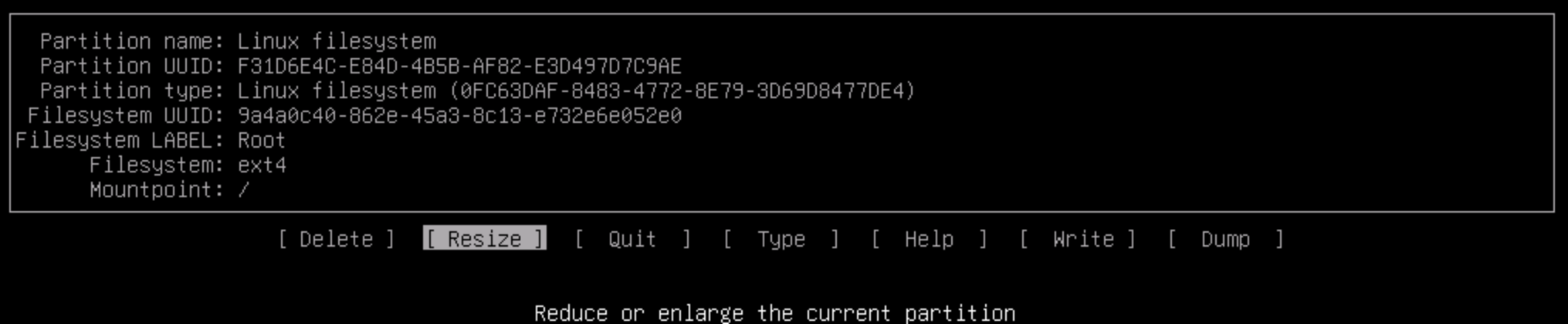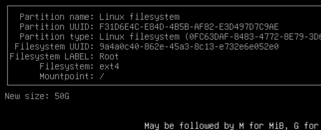 :$ fdisk -l Disk /dev/vda: 1000 GiB, 1073741824000 bytes, 2097152000 sectors Units: sectors of 1 * 512 = 512 bytes Sector size (logical/physical): 512 bytes / 512 bytes I/O size (minimum/optimal): 512 bytes / 512 bytes Disklabel type: gpt Disk identifier: A6061F2A-27A6-423F-B8E9-77CF41A2180C Device Start End Sectors Size Type /dev/vda1 2048 2097151964 2097149917 1000G Linux filesystem $ lsblk -f NAME FSTYPE FSVER LABEL UUID FSAVAIL FSUSE% MOUNTPOINTS vda `-vda1 ext4 1.0 Root 9a4a0c40-862e-45a3-8c13-e732e6e052e0 932.9G 0% /