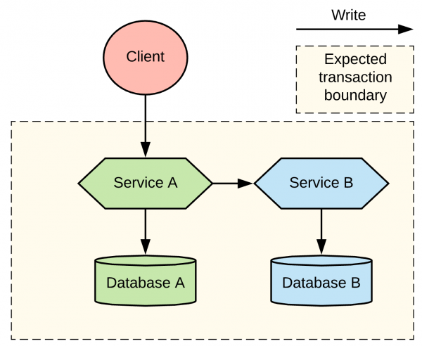 在这篇文章中,我们将使用一个示例场景来评估处理分布式事务中的双重写入的各种方法。我们的场景是一个客户端应用程序,它调用另一个微服务执行修改操作。Service A必须更新它的数据库,但它也必须调用服务B执行写操作,如图1所示。数据库的实际类型,服务与服务之间的交互协议,与我们的讨论无关,因为问题仍然是一样的。