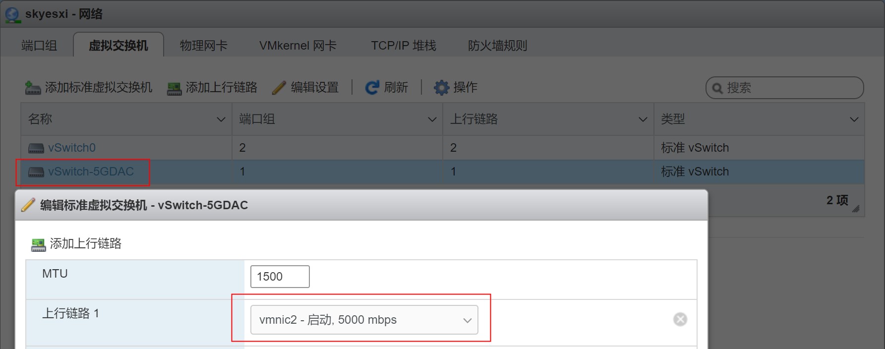 开始创建5g网络的虚拟交换机,上行链路选择上面的5g网卡: